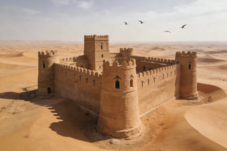 Stone in the style of a fortress in an ancient with towers