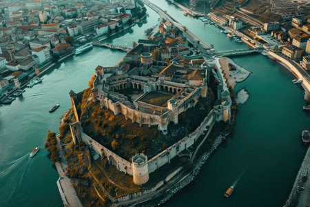 Generative AI : Aerial view of Saint Jorge castle a hilltop Moorish castle and palace ruins in Lisbon old town district Portugal