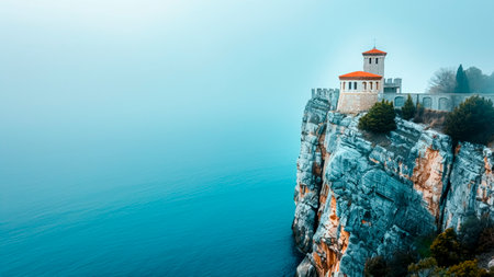 Ancient Monastery on a Cliff Overlooking the Sea. Historic Landmark, Serene Landscape, Spiritual Retreat, Copyspace.