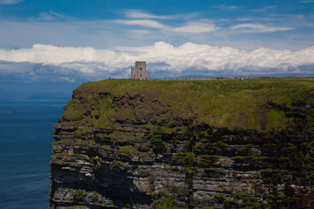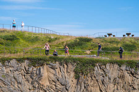 Cliffs of Moher, Ireland - April 2017 : People walking on a path on top of the Cliffs of Moher on a overcast, cloudy and gloomy day, Ireland