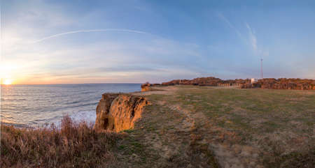 Sunset sea beach cliff horizon in beautiful nature calmness. Majestic sunrise shining soft on ocean shore island. Natural landscape background in environment. Peaceful nature solitude retreat concept.