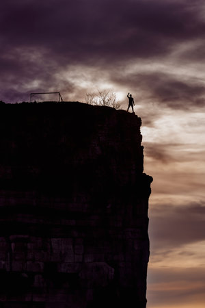 Silhouette of alone person on a mountain top at the dramatic sunset, Dramatic silhouettes of people against a rugged natural rock formation.