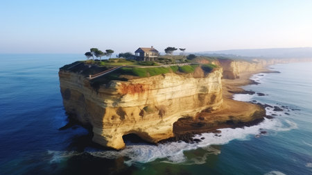 the photo showcases stunning cliffs along the shore, with the vast ocean just beyond. inspired by the style of beeple, it features an earth tone color palette and photorealistic details. the image exudes an austere simplicity, incorporating historical imagery. the light orange and dark cyan hues enhance the calm and serene beauty of the scene. ai generated