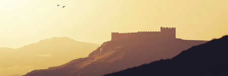 An ancient castle stands proudly on a hilltop, silhouetted against a breathtaking golden sunset, capturing the essence of history and tranquility.