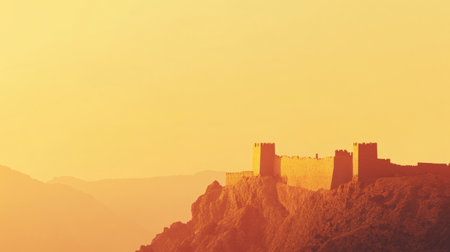 A captivating castle stands proudly atop a hill, bathed in warm sunset hues, offering a perfect canvas for text or storytelling.