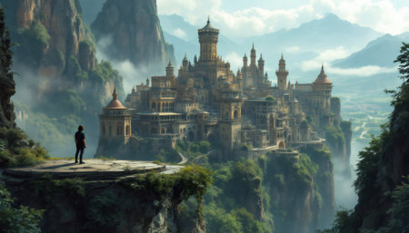 A lone figure gazes at a sprawling fantasy castle town nestled amidst misty cliffs and mountains Use for fantasy art or travel concepts.