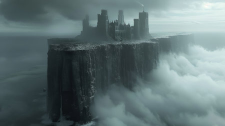 A citadel on top of a cliff in a layer of fog.