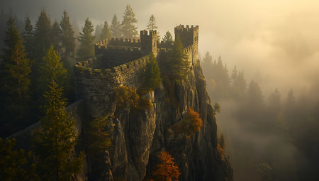 This captivating image showcases a medieval castle tower perched dramatically on a rocky cliff, shrouded in mystical fog. The blend of nature and history creates a serene yet intriguing atmosphere, perfect for transporting viewers to a bygone era.