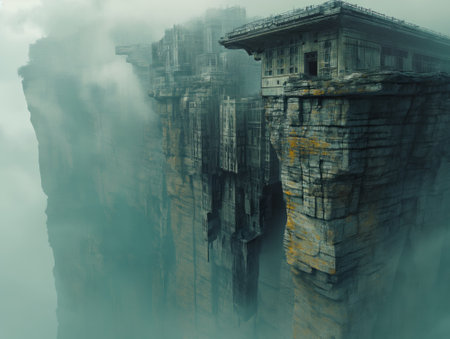 Steep cliffs with a misty gloomy sky. A thick, eerie fog hangs over the mountain and the valley.