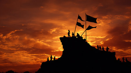 Silhouette of people with flags at sunset in Bagan, Myanmar