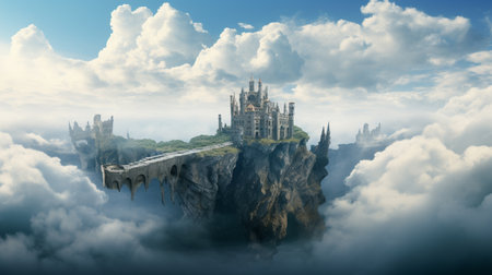 levitate awesome castel, surounded by cloud and bird on the sky high background. Generative AI