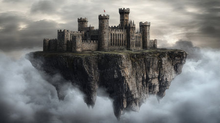 A grand medieval castle hovers on a rocky island, surrounded by soft clouds, creating a surreal atmosphere.