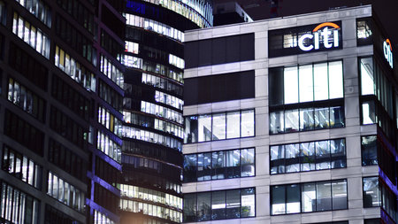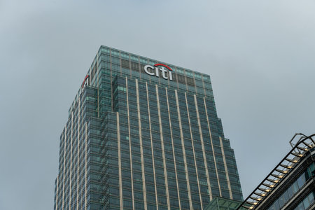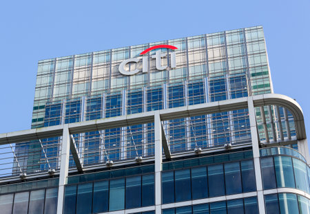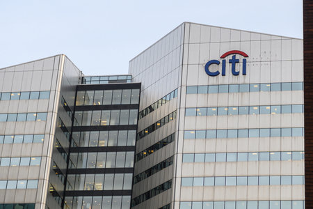 Toronto, ON, Canada - March 15, 2025: A Citi logo is displayed on the exterior of a modern glass office building. The reflective facade captures the surrounding cityscape. The signage stands out in blue and red.