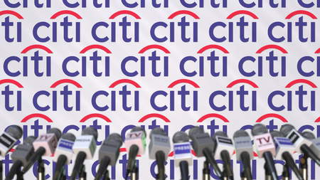 CITI company press conference, press wall with logo and mics, conceptual editorial 3D rendering