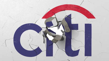 Crushing concrete wall with logo of Citigroup. Crisis conceptual editorial 3D rendering