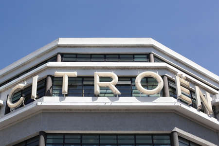Lyon, France - May 21, 2020: Citroen sign on a facade. Citroen is a major french automobile manufacturer, part of the Peugeot Citroen group since 1976