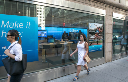 New York, July 26, 2016: People walk by a Citibank retail location in Manhattan.