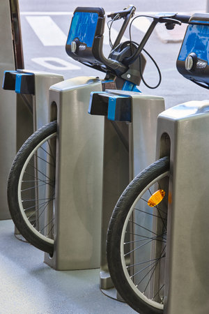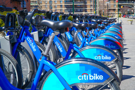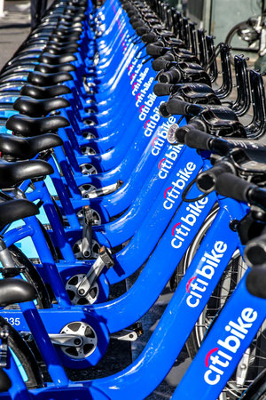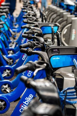 NEW YORK, USA - APRIL 14, 2018: Citi bank bikes docked in New York City. Citi bike is a bike sharing system available throughout the five boroughs.