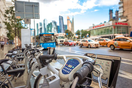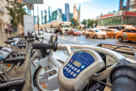 MOSCOW, RUSSIA - JULY 27, 2020: Bicycle rental in the center of Moscow. City bikes for rent at automatic rental station in Moscow.