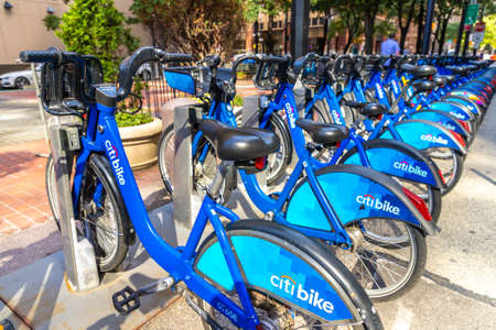 New York City, USA - August 1, 2018: A row of rental bikes with advertising from Citibank in their docking stands on a street in New York City, USA
