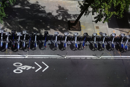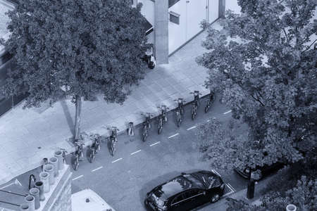 Bikes rental. Public sharing bicycles lined up on the street, New York, Manhattan downtown. High angle view, copy space