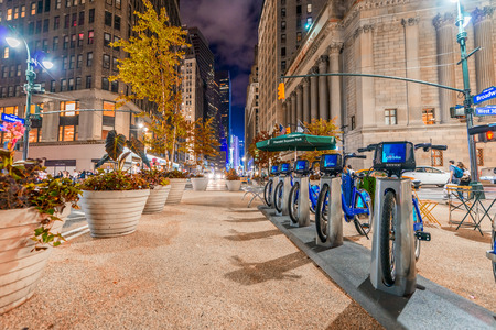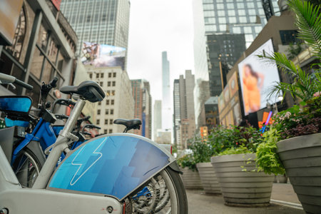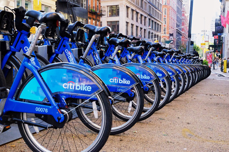 New York, USA, October 1, 2016: City bikes on Broadway prepared to rent. The program has largest bike share, with 12,000 bikes and 750 stations across Manhattan, Brooklyn, Queens and Jersey City
