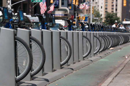 New York - Aug 20: several bicycles from city bike parked in a row waiting to be hired in downtown New York on August 20, 2014 in New York, USA