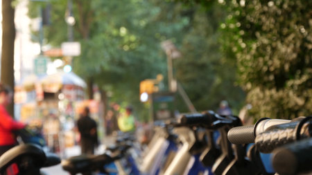 Manhattan Midtown street New York City, United States. Rental bicycle parking on Central Park West, trees summer greenery. Bike for rent in row. Defocused people pedestrian on sidewalk pavement.