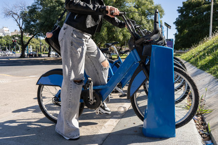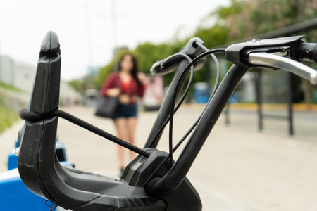 vertical photo of the detail of hands taking a bike from an urban bicycle rental parking, concept of active lifestyle and sustainable mobility