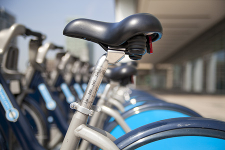 LONDON, UK - MAY 7, 2014 Boris bikes parking on business Canary Wharf aria, sponsored by Barkley s bank Popular city transport among Londoners