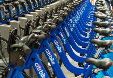 NEW YORK CITY - JUNE 8, 2013: New blue CitiBikes lined up in Manhattan downtown. Citi Bike is the largest bike sharing program in the United States