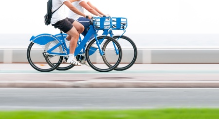 Natural bokeh of bike rental, blurred out of focus background. Abstract beautiful backdrop for text or advertising. Unfocused city view