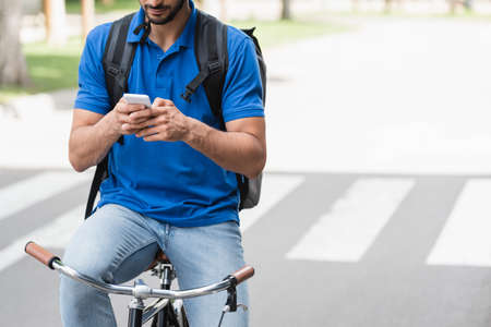 Cropped view of courier using smartphone while riding bicycle outdoors