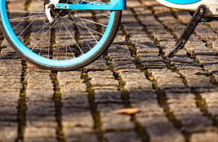 Blue bicycle parked on a cobblestone pavement. Close-up.