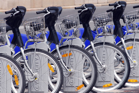 Reims, France - September 17, 2022 Accessible bicycles to hire for short periods of time, usually for a few hours parked in the street and part of the public transport system of Reims