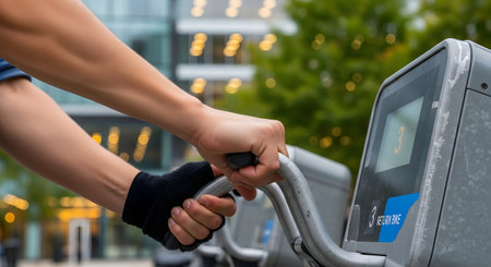 A person wearing a glove grips the handlebars of a bike share station, ready to ride.