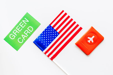 United States of America permanent resident cards. Immigration concept. Text green card near passport cover and US flag top view on white background
