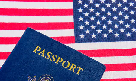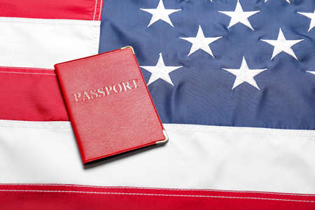 US passport is symbol of citizenship naturalization over background of American flag