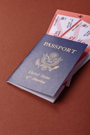 United states of america passport, airline tickets and money on a blue background. Conceptual background on the theme of tourism and travel