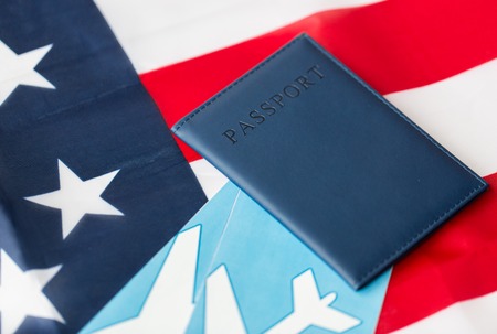 travel, tourism, emigration and visa concept - american national flag, passport and air tickets