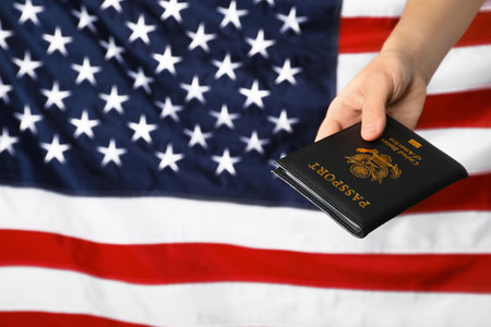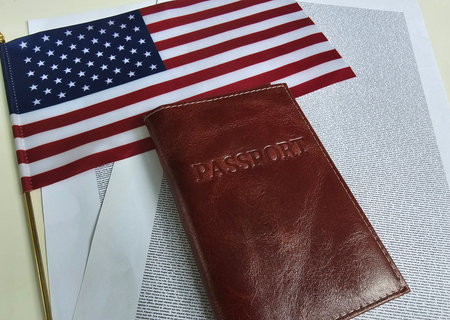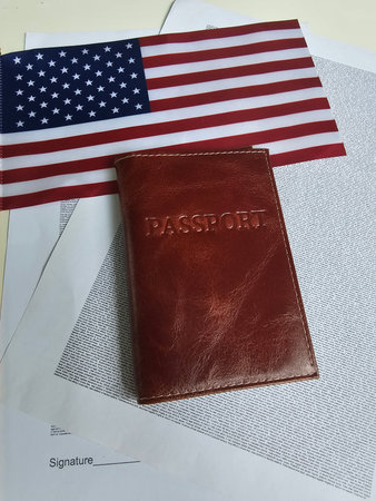US passport represents citizenship naturalization over background of American flag