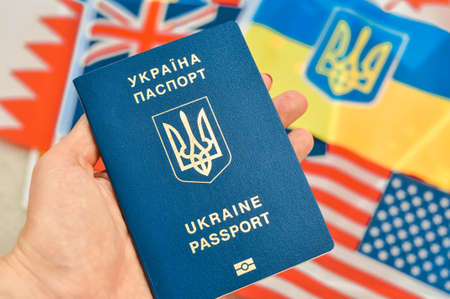 Ukrainian internUkrainian international biometric passport for travel close up.Translation from Ukrainian: 'Ukraine, passport'.