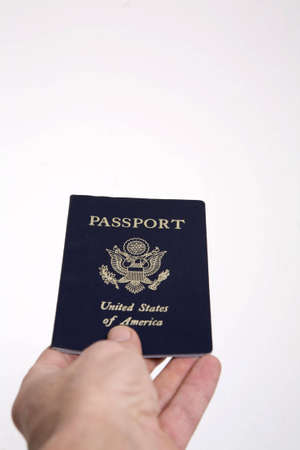 Shot from perspective of the traveler, closeup of a hand giving a US passport.