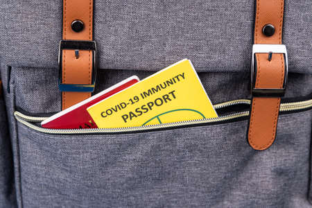 Conceptual Covid-19 Immune Passport and travel document tucked into hand luggage pocket