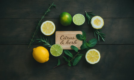 Vibrant lemons, limes, fresh rosemary, and mint leaves arranged around a wooden sign with citrus & herb text on a dark rustic wooden table. perfect for healthy eating, natural ingredients, and culinary concepts.