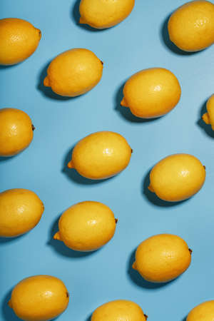 Yellow Lemon fruit patterns on a blue background, beautiful pattern. Top view, full screen