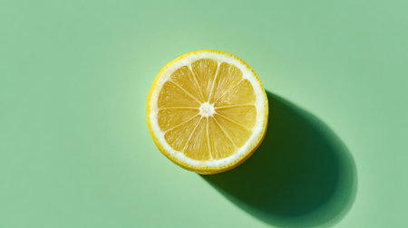 Half sliced lemon on a green background casting a shadow, fresh and vibrant.