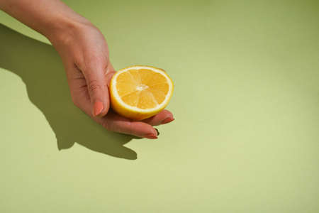 A female caucasian hand holding a half of a lemon on a green background