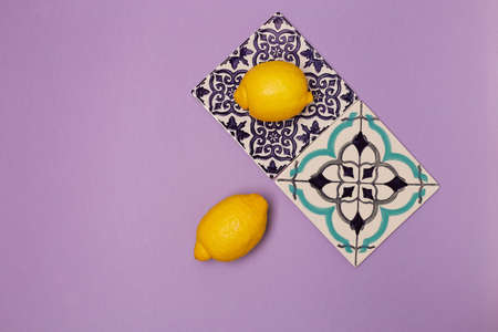 Ceramic tiles with ornament on a purple background and juicy lemons, top view