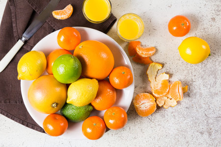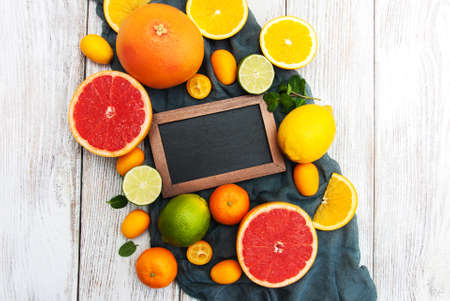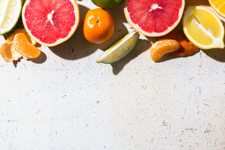 Citrus fruits. Healthy diet eating. Top view with copy space
